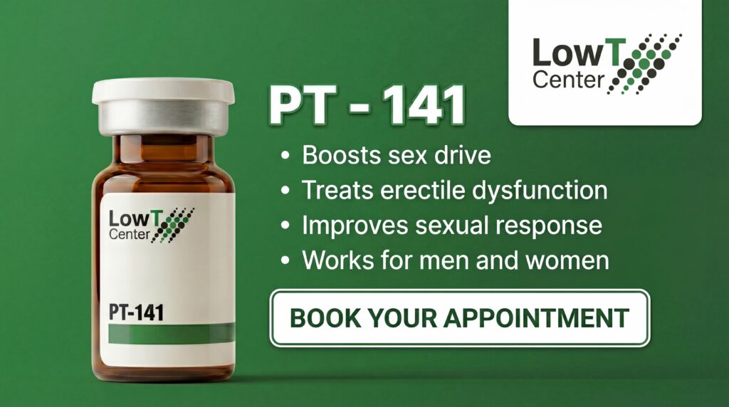 At Low T Center, we offer free consultations so a provider can help you understand what’s going on below the surface and whether PT-141 is a fit for you. We also offer testosterone and hormone replacement therapy as alternative options or in combination with peptide treatments when appropriate.